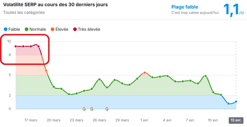 Avant cette date, le Semrush Sensor (US) a oscillé entre 9.1 et 9.5/10 durant tout début mars 2026.