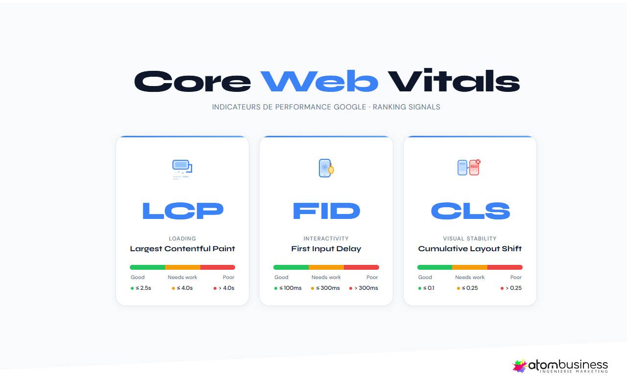 | CLS | Stabilité visuelle de la mise en page | < 0,1 | Images sans dimensions, polices web, publicités | Attributs width/height, font-display: optional |