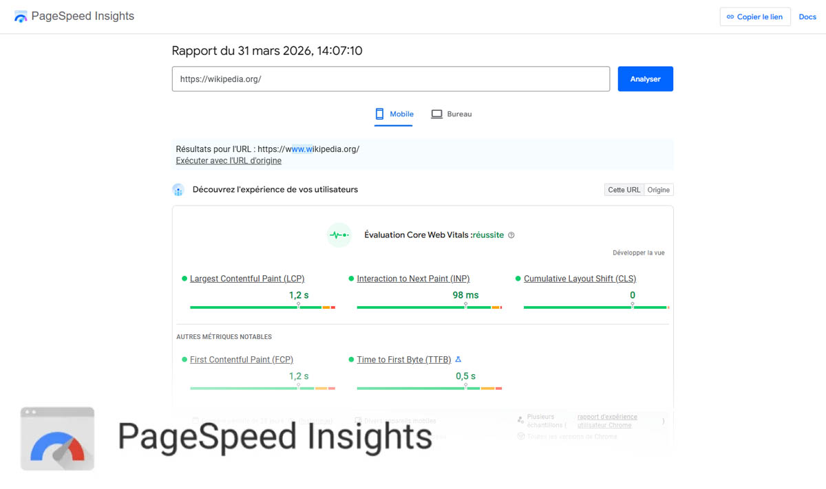 PageSpeed Insights analyse une URL précise et fournit à la fois les données terrain CrUX (si disponibles) et les données lab Lighthouse. C'est l'outil de diagnostic par URL. Il identifie quel élément est le LCP, quelles tâches bloquent l'INP, quels éléments génèrent du CLS.