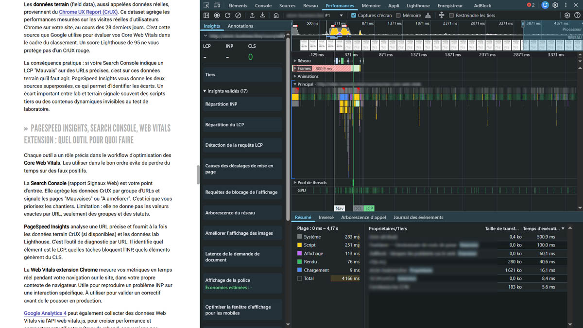 La conséquence pratique : si votre Search Console indique un LCP "Mauvais" sur des URLs précises, c'est sur ces données terrain qu'il faut agir. PageSpeed Insights vous donne les deux sources superposées, ce qui permet d'identifier les écarts. Un écart important entre lab et terrain signale souvent des scripts tiers ou des contenus dynamiques invisibles au test de laboratoire.