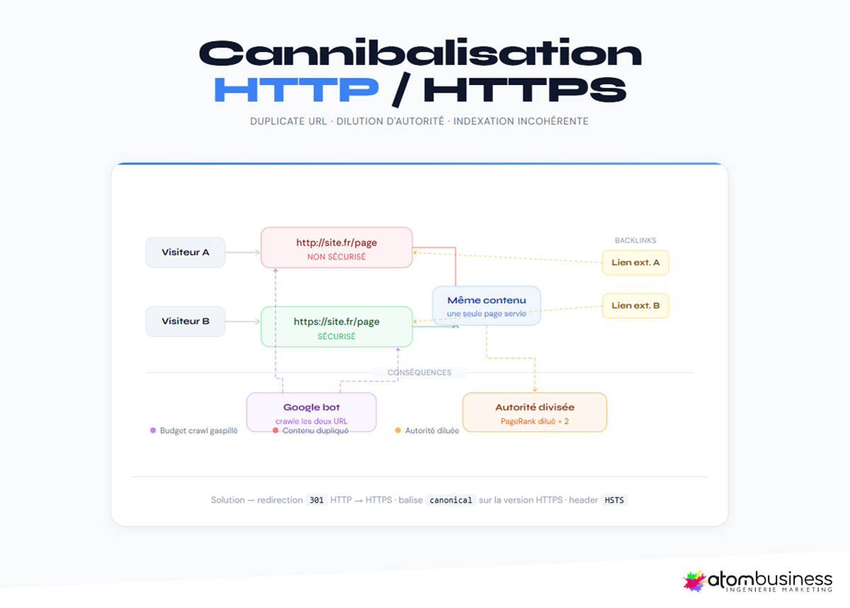Pourquoi c'est dangereux. Le contenu dupliqué dilue l'autorité thématique. Les liens entrants se répartissent entre les deux versions. Le budget de crawl est gaspillé sur des URLs fantômes. Dans les cas extrêmes, c'est la version HTTP, plus ancienne, avec plus de liens historiques, qui s'indexe préférentiellement, reléguant la version HTTPS à un statut secondaire.